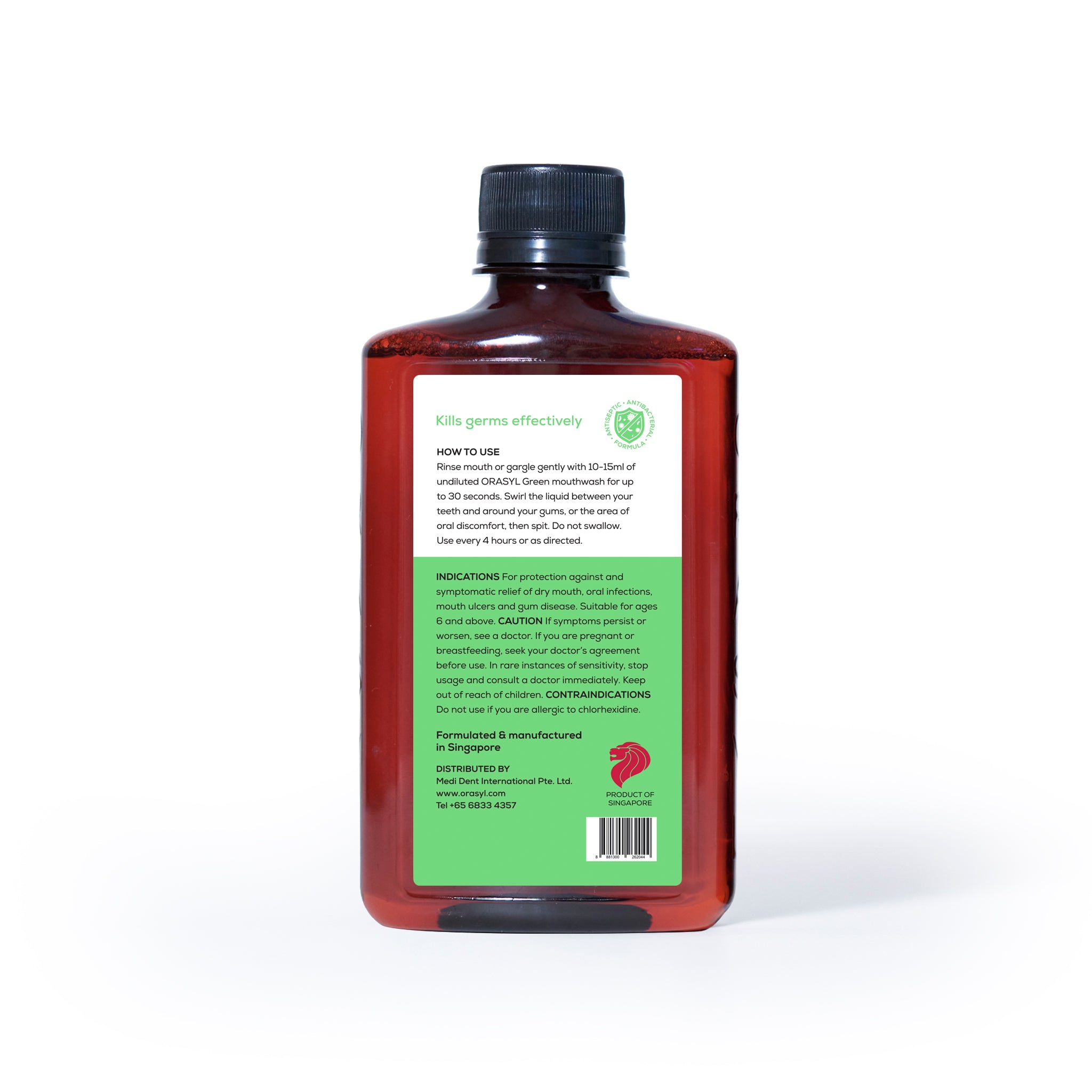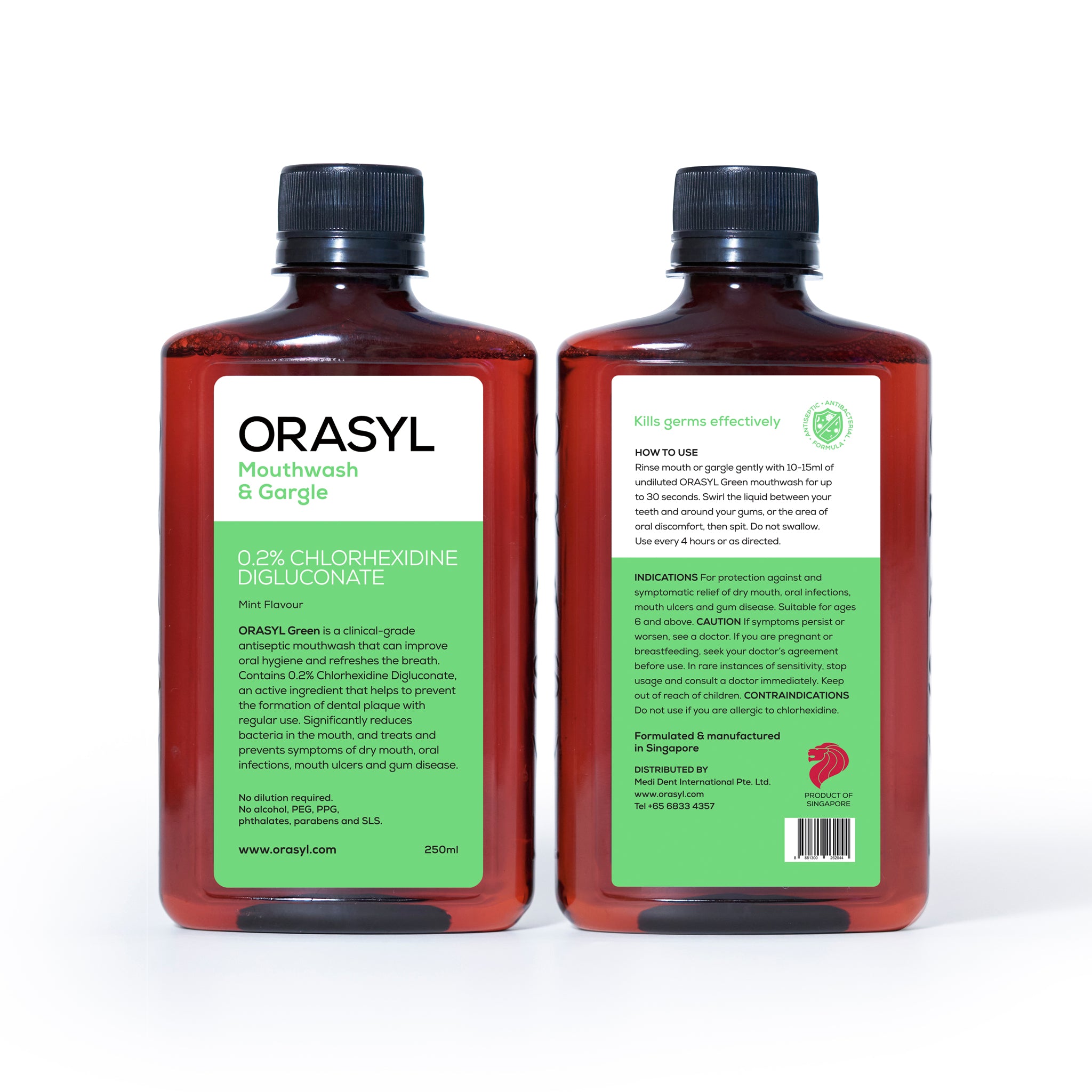 ORASYL Green is a clinical-grade mouthwash and gargle that contains the active ingredient 0.2% Chlorhexidine Digluconate.