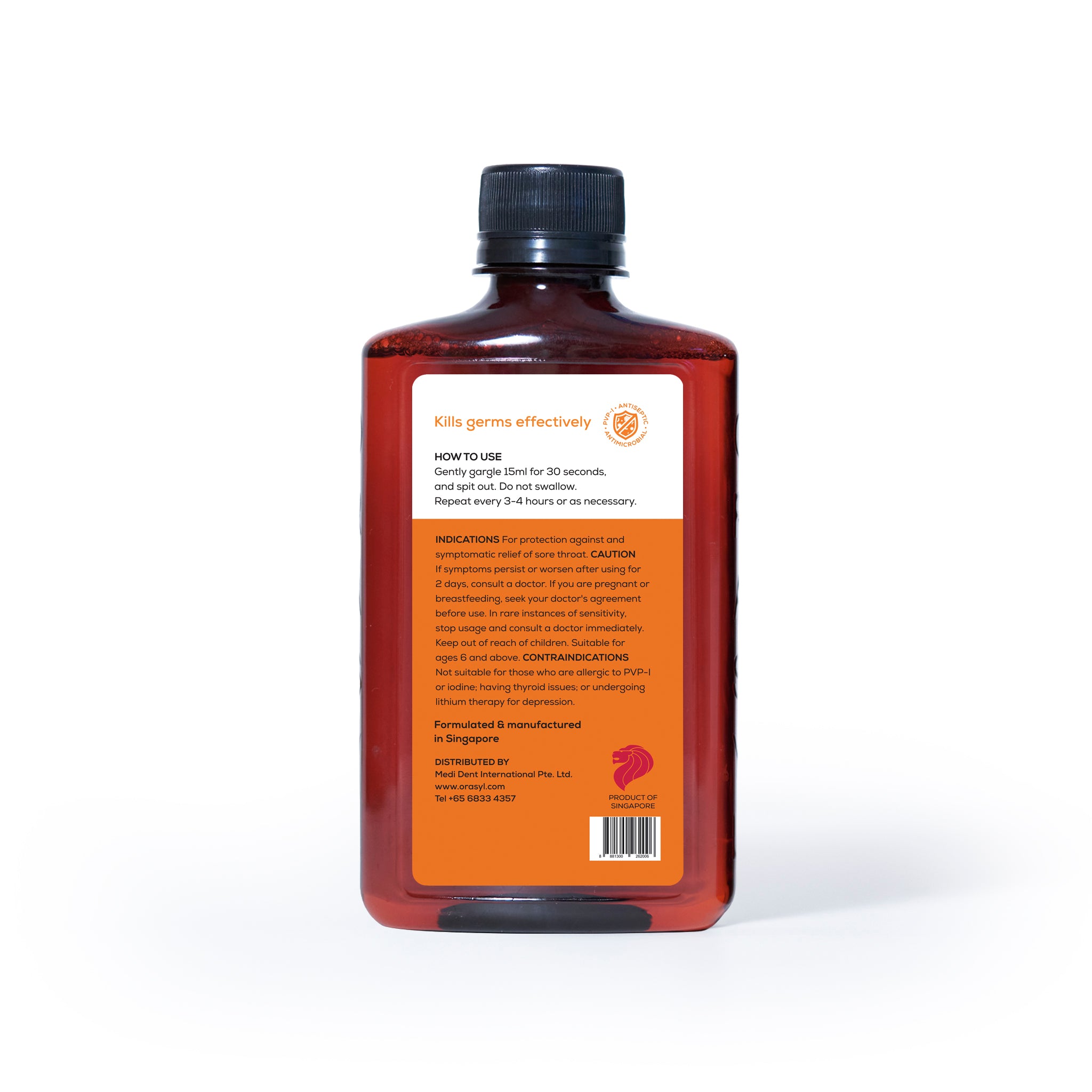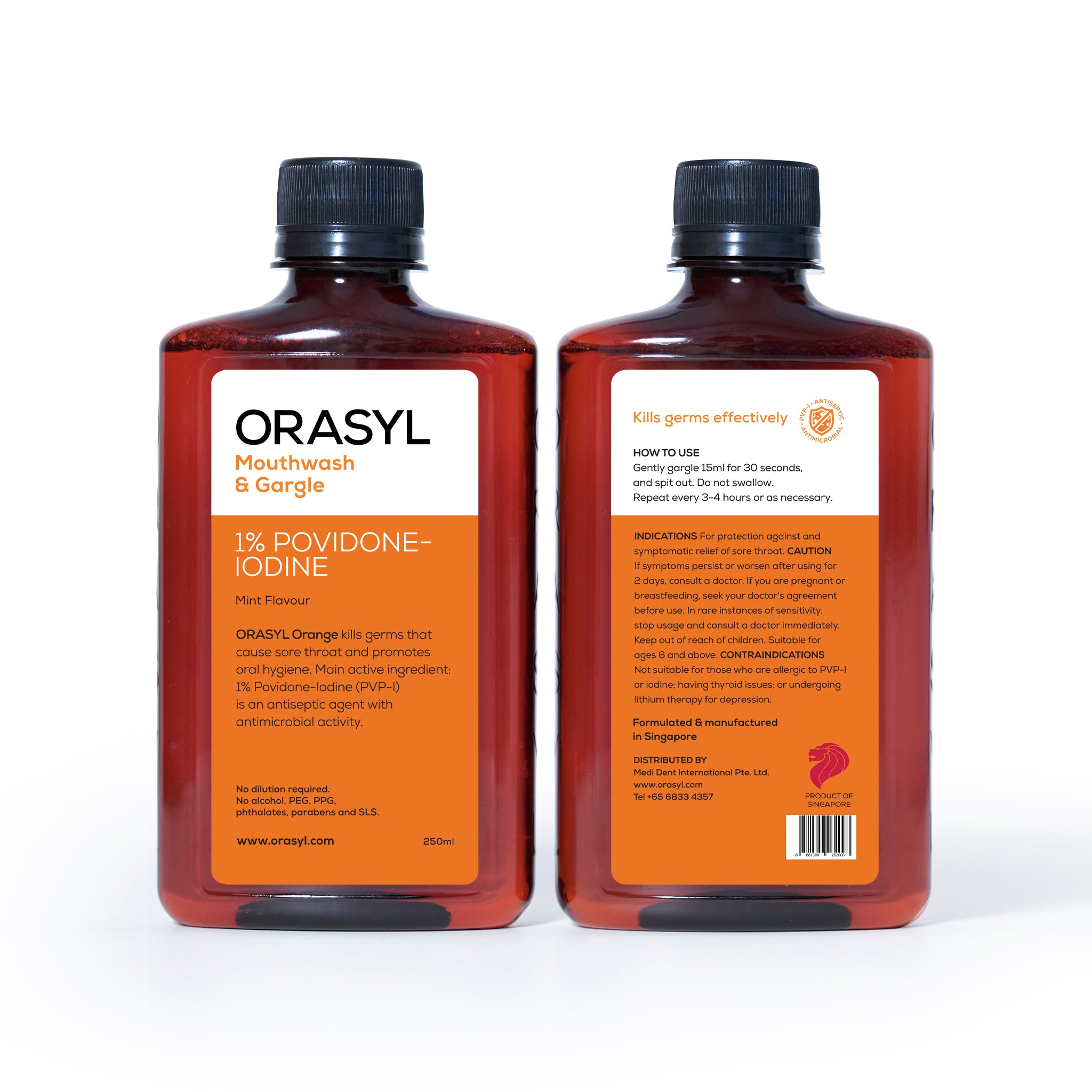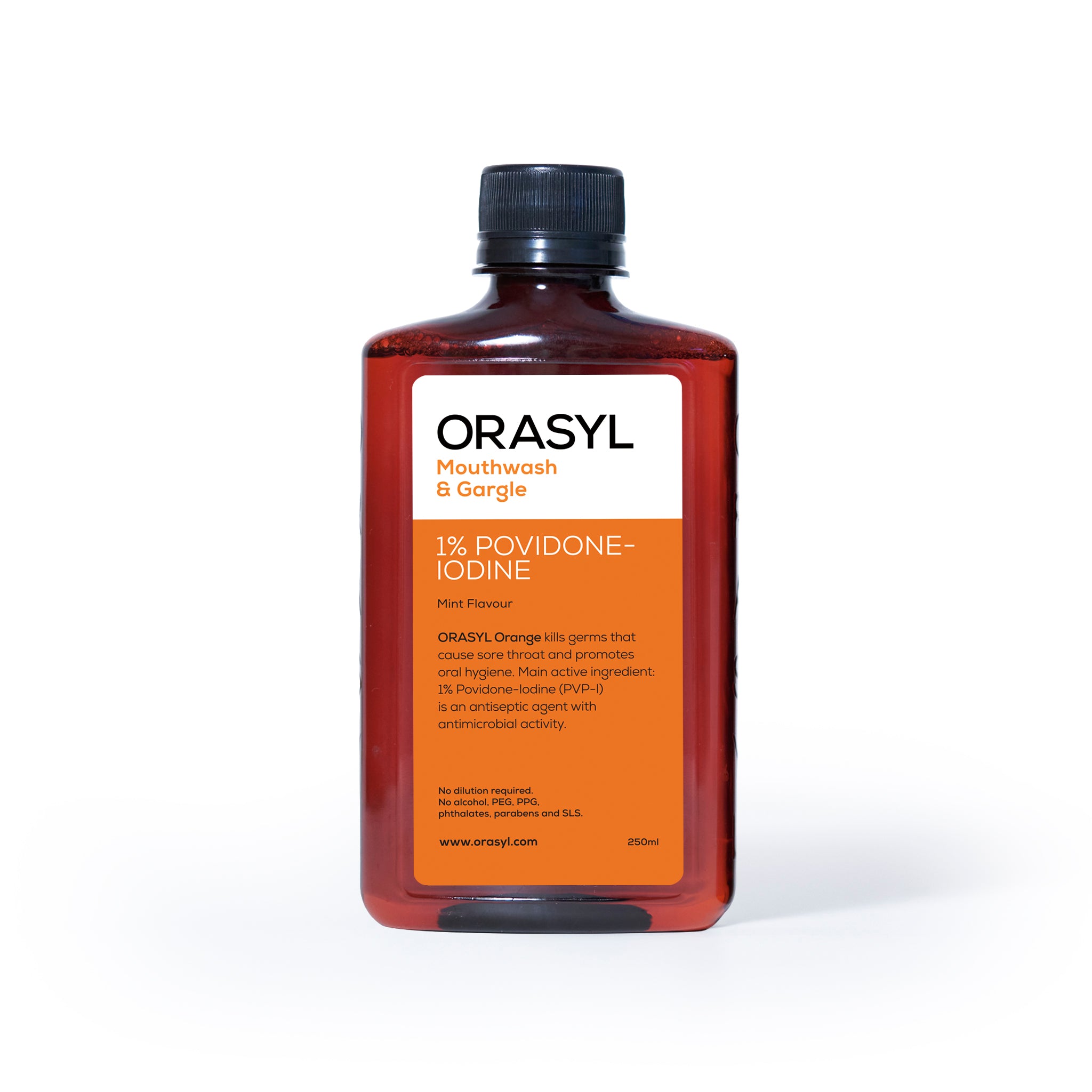 ORASYL Orange is a specially formulated mouthwash and gargle that contains the active ingredient 1% Povidone-Iodine (PVP-I).