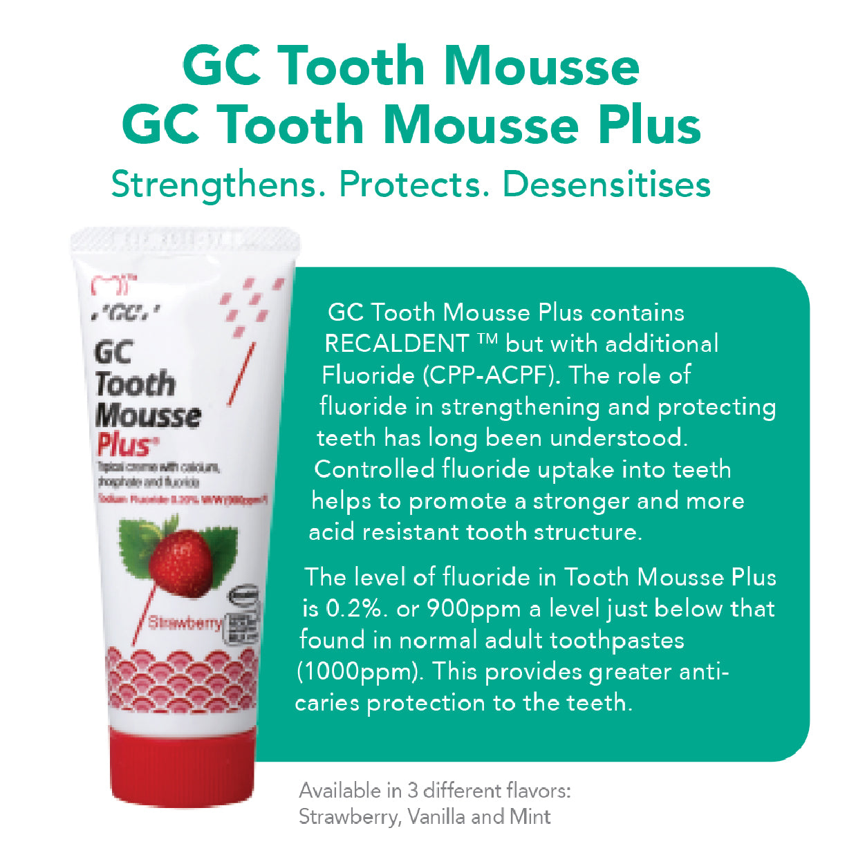 Now you can give teeth essential minerals with GC Tooth Mousse and GC Tooth Mousse Plus, a unique topical tooth creme that can be applied daily. GC Tooth Mousse Plus offers the same great benefits of regular GC Tooth Mousse and is enhanced with fluoride.