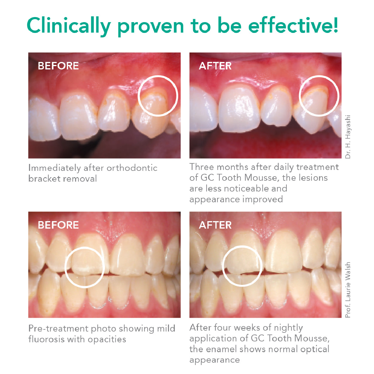 • Tooth Mousse with RECALDENT™ (CPP-ACP) has a proven clinical success record for patients with increased caries risk and white spot lesions (these include: orthodontic appliances, bleaching, consumption of sports drinks and medical therapies causing low salivary flow or xerostomia)
