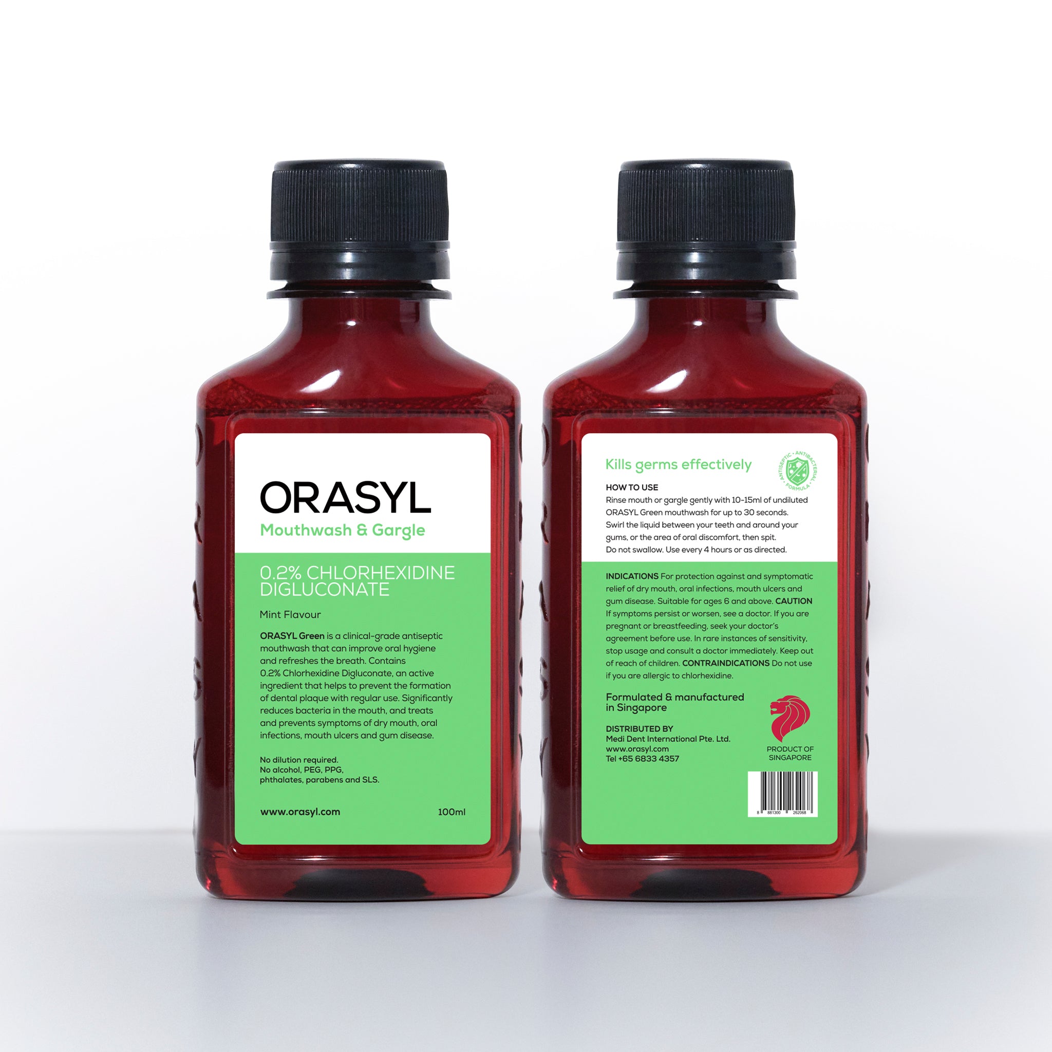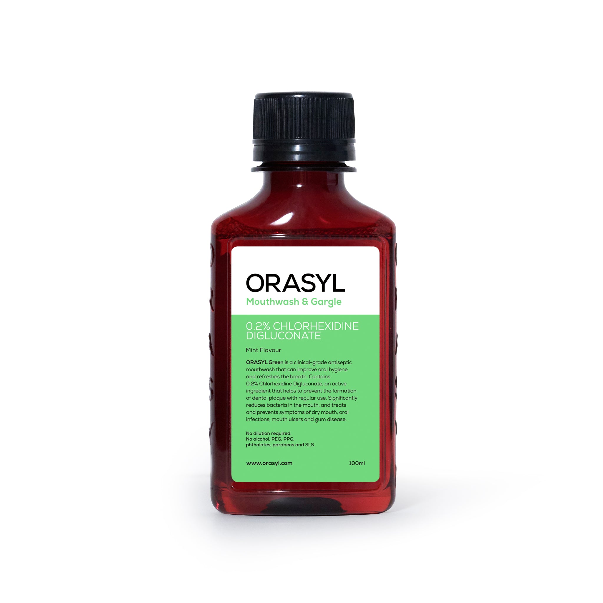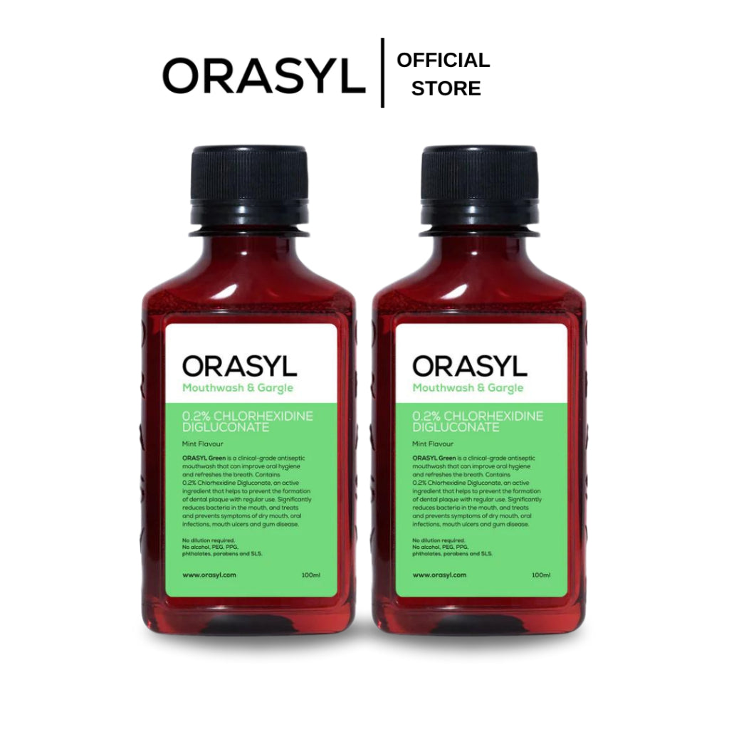 ORASYL Green is a clinical-grade mouthwash and gargle that contains the active ingredient 0.2% Chlorhexidine Digluconate.