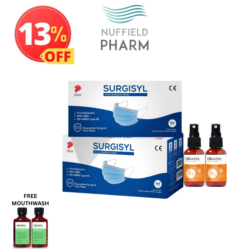 Orasyl x Surgisyl Hygiene Duo - 2 boxes of Surgisyl Mask & 2 bottles of Orasyl Orange 50ml Spray