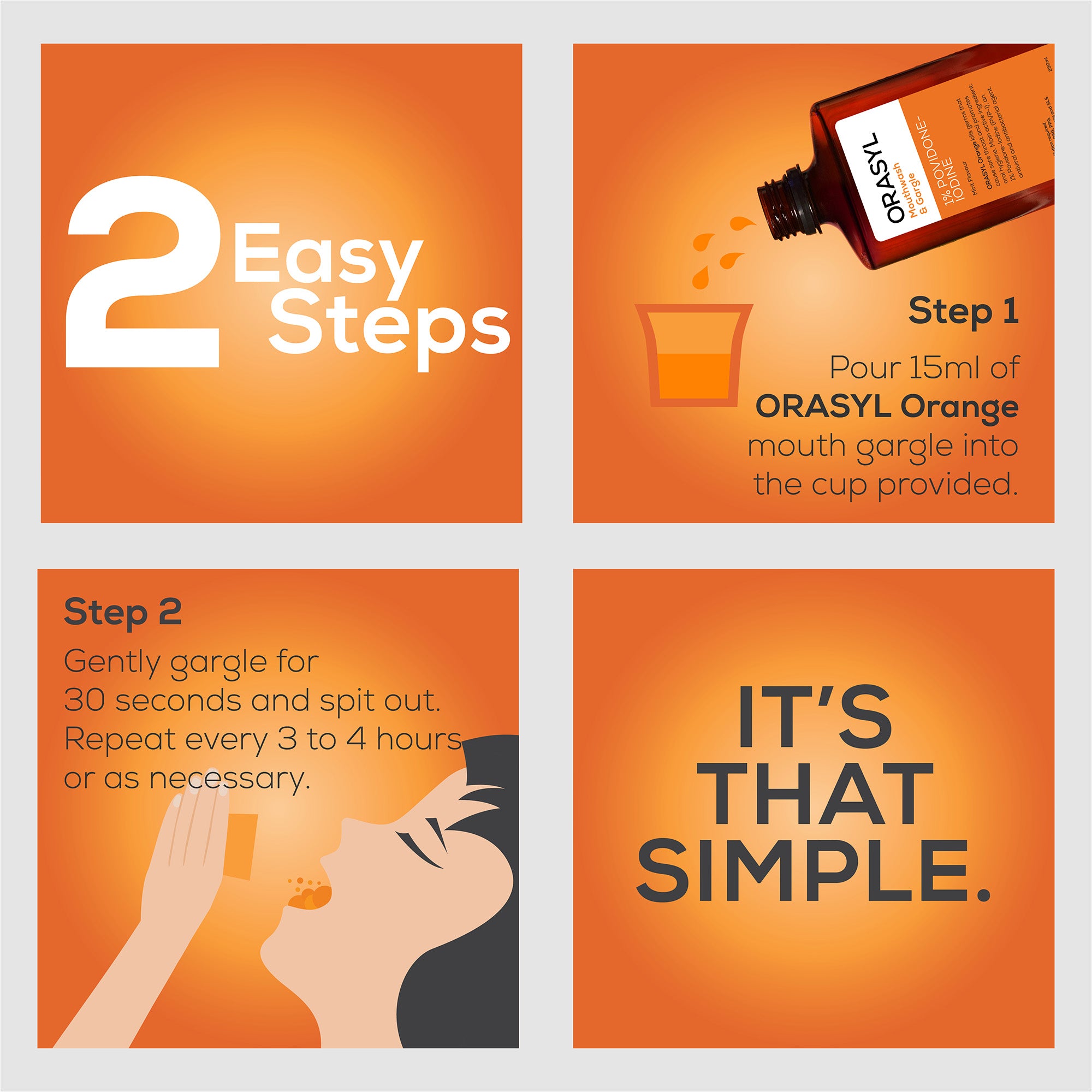 ORASYL 橙 是一种特殊配方的漱口水和含活性成分的漱口水 1% 聚维酮碘 (PVP-I) 。